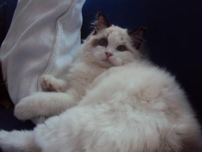 O plemeni:Ragdoll je velká a těžká kočka,proslulá zejména svou klidnou povahou.Má polodlouhou srst jemné struktury.Barvy a odznaky se vyvíjejí pomalu často 2-4 roky.Jsou dobře osvalené a hmotností předstihují ostatní plemena koček,ale je to plemeno velmi dobromyslné.Snadno se vycvičí pomocí odměny,může i aportovat.Nejkrásnější na ragdollovi jsou jeho překrásné modré oči.
